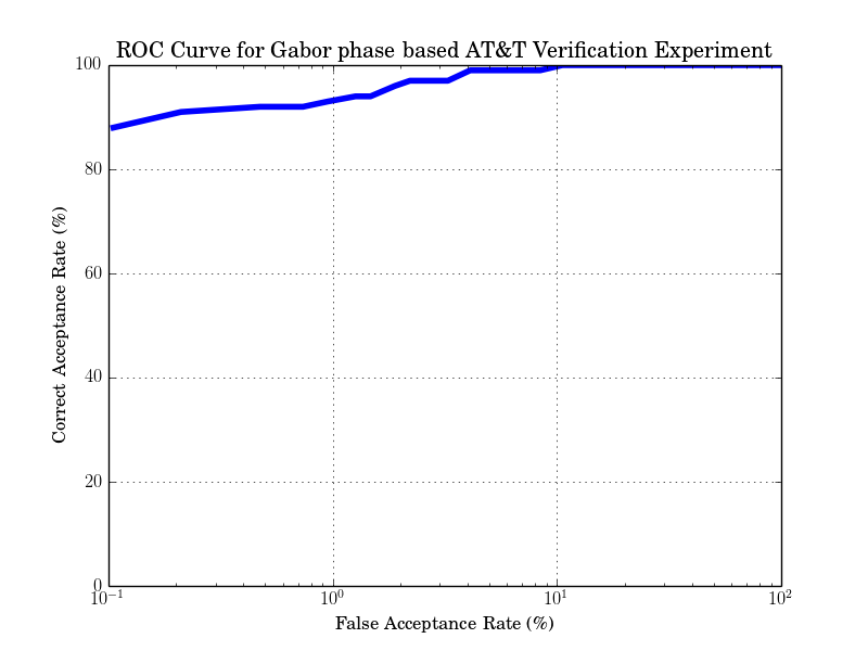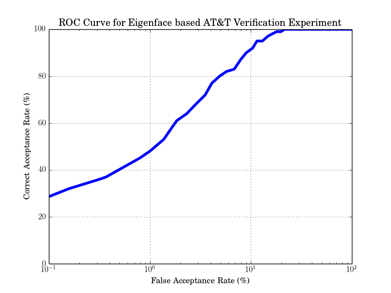 Since this method is better for suited for small image databases, the resulting verification rates are better. The expected ROC curve is: