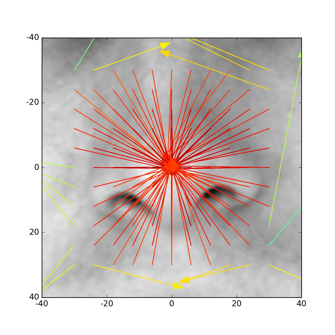 Hence, this function can be used to localize landmarks. In the following example, we use the Gabor jet at the nose tip as a reference, and we compute the disparity from Gabor jets extracted from around that offset position. We plot these disparities as arrows:
