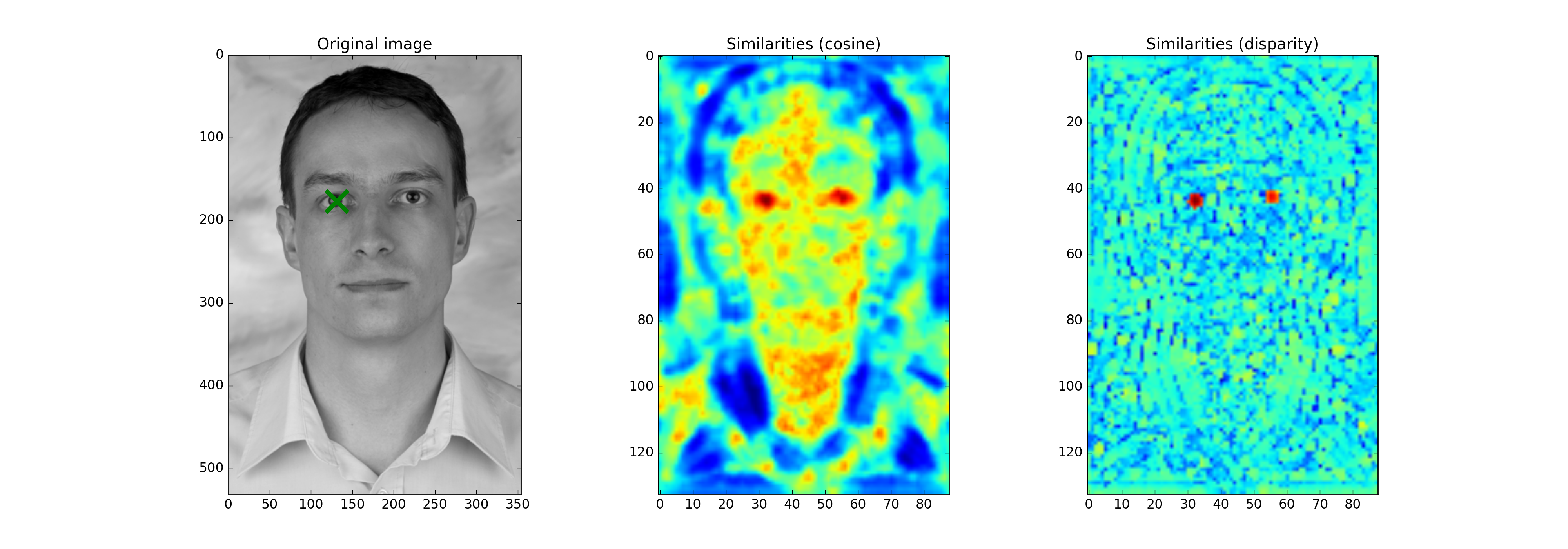 As can be clearly seen, both eye regions have high similarities with both similarity functions (remember, we are searching with only the right eye Gabor jet).