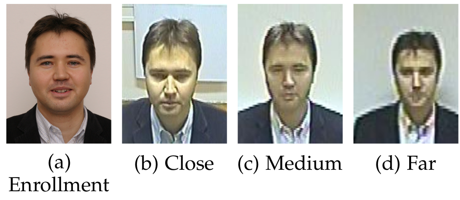 The surveillance camera face (SCface) dataset cite{scface} contains images taken by different low-resolution video surveillance cameras at three different distances. The dataset has three types of images and they are close, medium, and far. 44 identities are used in the dev set, and 43 for the in the evaluation set. One frontal image taken in passport quality as shown in scface:enroll is used for model enrollment, which differs dramatically in quality from the probe images as we can see in the image below.