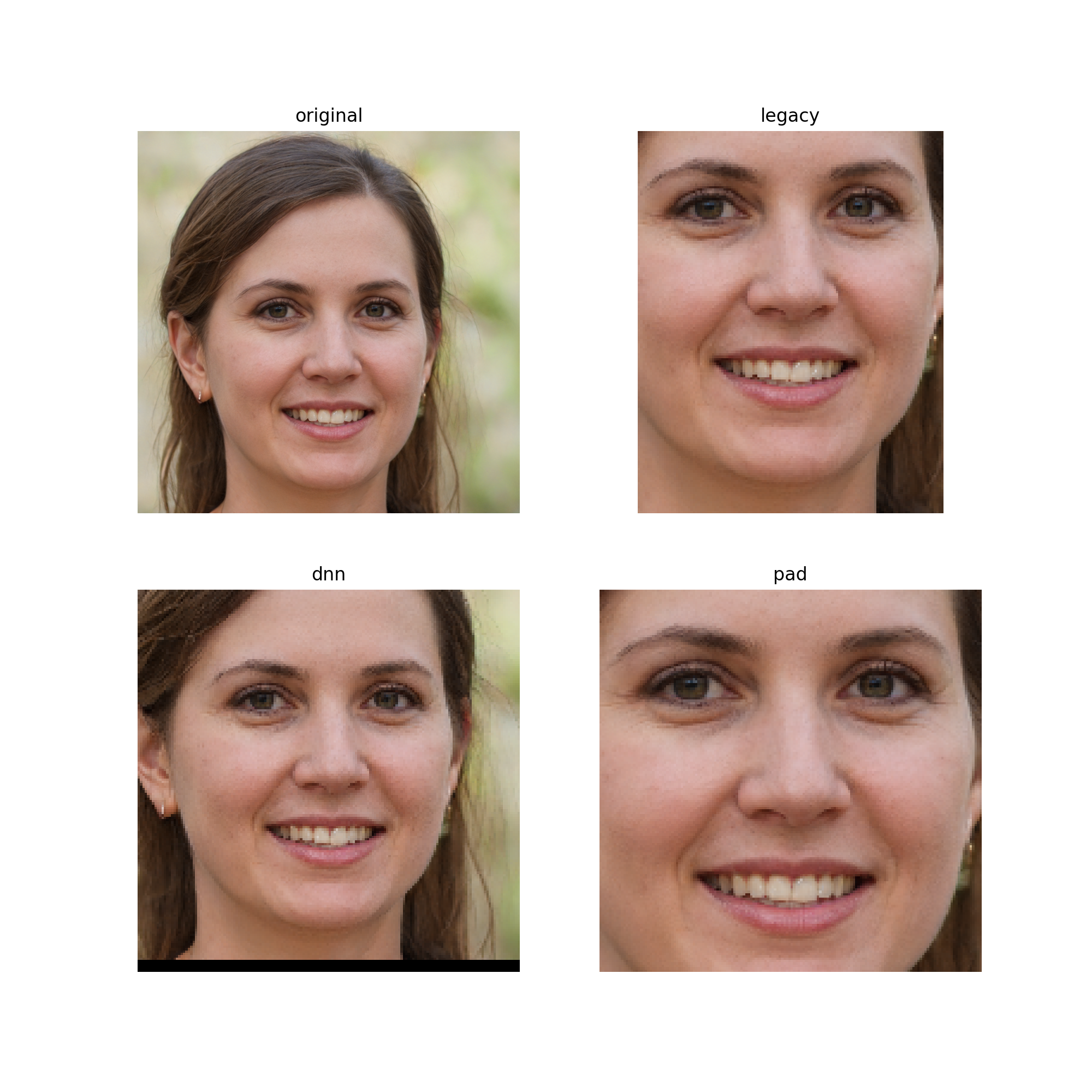 legacyTight crop, used in non neural-net baselines such asgabor-graph,lgbphs. It is typically use with a 5:4 aspect ratio for thecropped_image_sizednnLoose crop, used for neural-net baselines such as the ArcFace or FaceNet models.padTight crop used in some PAD baselines