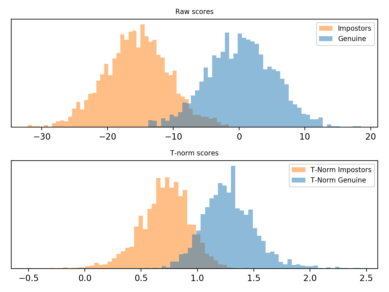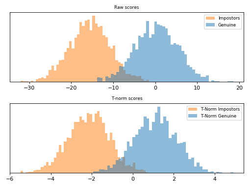 T-norm introduces extra computation during scoring, as the probe samples need to be compared to each cohort model in order to have \(\mu\) and \(\sigma\).