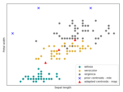 Bellow follow an intuition of the GMM trained with the MAP estimator using the Iris flower dataset.