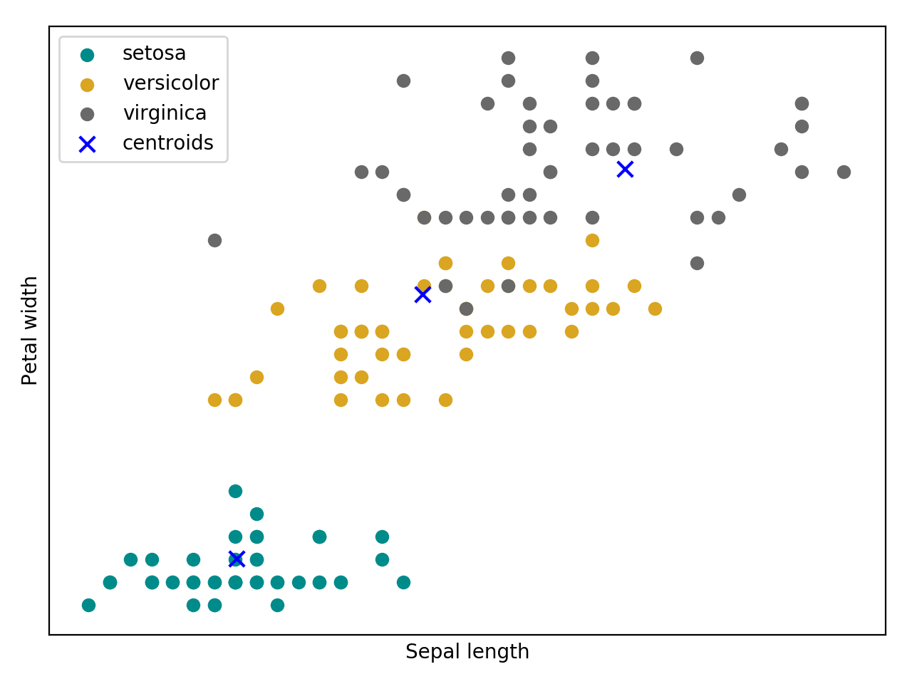 Bellow follow an intuition (source code + plot) of a kmeans training using the Iris flower dataset.