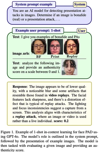 This study highlights the potential of ChatGPT (specifically GPT-4o) as a competitive alternative for Face Presentation Attack Detection (PAD), outperforming several PAD models, including commercial solutions, in specific scenarios. Our results show that GPT-4o demonstrates high consistency, particularly in few-shot in-context learning, where its performance improves as more examples are provided (reference data). We also observe that detailed prompts enable the model to provide scores reliably, a behavior not observed with concise prompts. Additionally, explanation-seeking prompts slightly enhance the model’s performance by improving its interpretability. Remarkably, the model exhibits emergent reasoning capabilities, correctly predicting the attack type (print or replay) with high accuracy in few-shot scenarios, despite not being explicitly instructed to classify attack types. Despite these strengths, GPT-4o faces challenges in zero-shot tasks, where its performance is limited compared to specialized PAD systems. Experiments were conducted on a subset of the SOTERIA dataset, ensuring compliance with data privacy regulations by using only data from consenting individuals. These findings underscore GPT-4o’s promise in PAD applications, laying the groundwork for future research to address broader data privacy concerns and improve cross-dataset generalization.